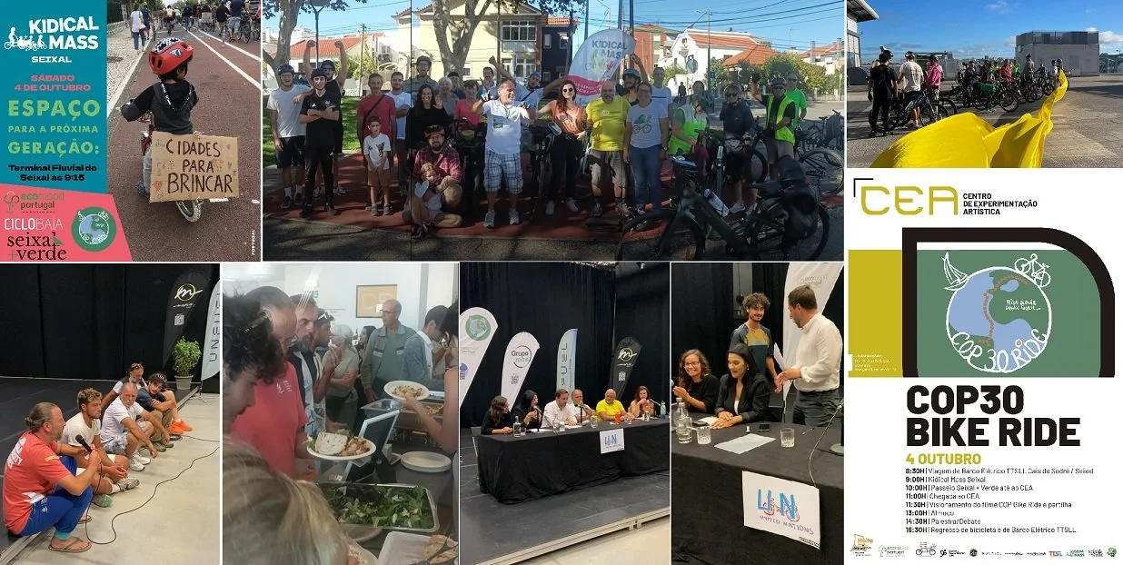 Chegados à Moita, começámos pelo filme, seguindo-se uma agradável conversa dos participantes com o público presente. O almoço esteve a cargo da associação Desafio Vegetariano, para quem estes caterings são acções de sensibilização. E depois houve ainda tempo para um debate com o Presidente e a Vice-Presidente da Câmara, além da assinatura formal do compromisso com algumas das propostas desta COP30 Bike Ride, cujo último trajecto europeu foi o regresso até Lisboa, novamente de bicicleta e barco, com uma certeza: a COP31 Bike Ride virá do Brasil e entrará na Europa por aqui.