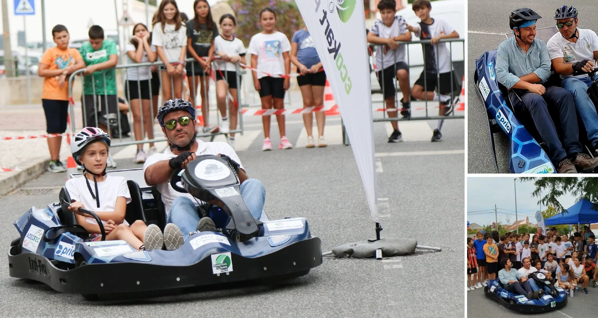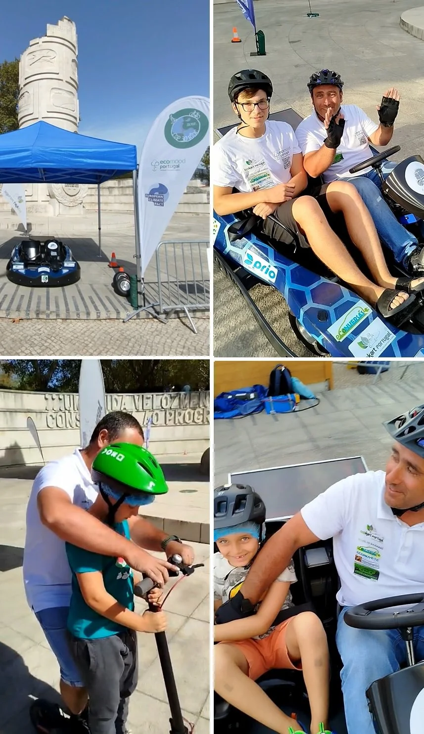 Este ano, além do Ecokart Twin da Kart Effect, contámos também com uma trotineta da Acecitec, para ensinar mobilidade suave segura com este veículo prático e algo contestado. Como sempre, a emoção de andar ao lado de um dos nossos pilotos serviu de mote para se falar de desportos motorizados sustentáveis, mobilidade elétrica, reutilização, reciclagem, baterias, conversão de veículos, etc.