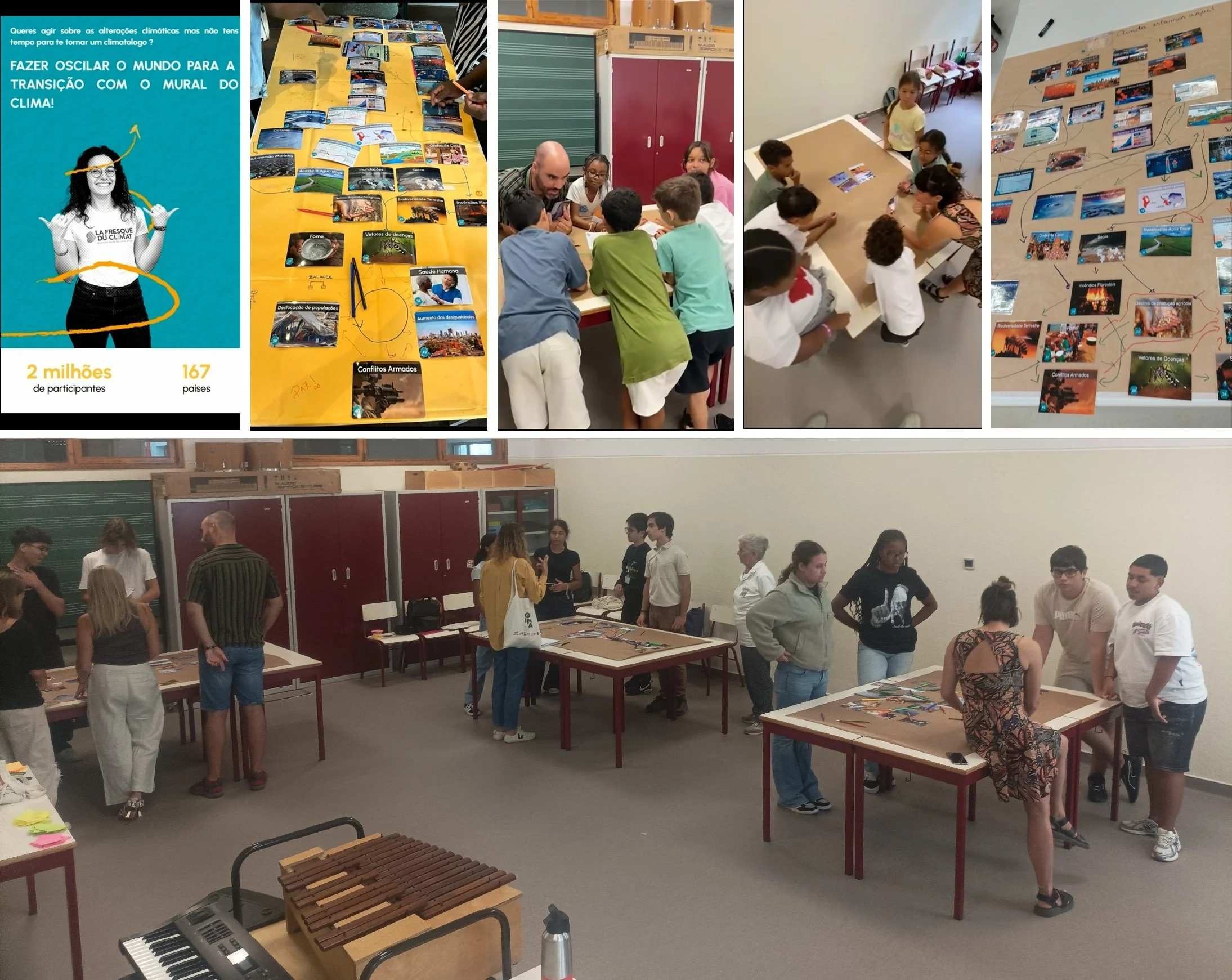 Por isso mesmo, no programa da Semana Europeia da Mobilidade de Oeiras inserimos dois workshops Mural do Clima, realizados pela nossa parceira Transitar. De forma pedagógica, divertida e proactiva, dois grupos de jovens da Escola de São Bruno aprenderam as bases de causas e efeitos das alterações climáticas. Com cada grupo dividido por 4 murais em branco, no final do dia, com base nos mesmos cartões de causas e efeitos, tivemos 8 Murais do Clima diferentes, cada um com seu nome.